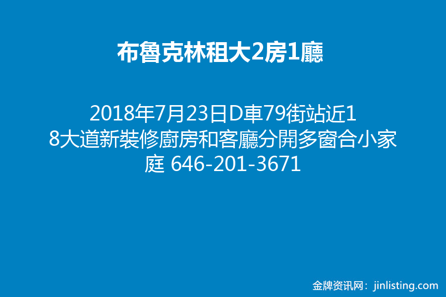 D車79街站近18大道超市新裝修廚房和客廳分開多窗包暖氣熱水合小家庭646-201-3671或917-702-4150