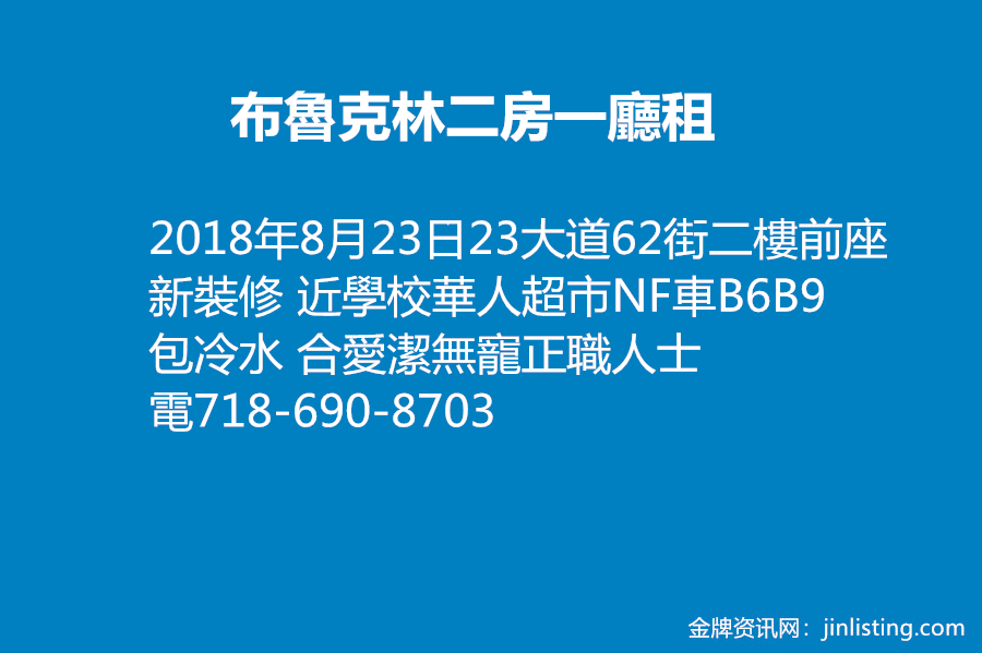 23大道62街二樓前座,新裝修,近學校華人超市NF車B6B9包冷水,合愛潔無寵正職人士,電718-690-8703