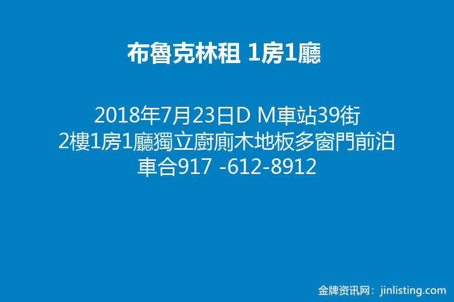 D M車站39街2樓 1房1廳獨立廚廁木地板多窗門前泊車合正職愛潔人仕或夫婦洽917 -612-8912或212 -962-6234