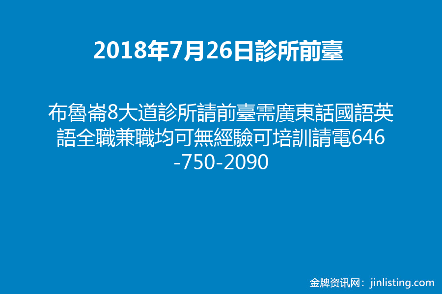 布魯崙8大道診所請前臺需廣東話國語英語全職兼職均可無經驗可培訓請電646-750-2090