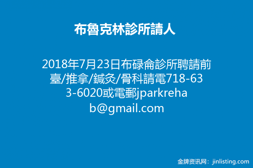 布碌侖診所聘請前臺/推拿/鍼灸/骨科請電718-633-6020或電郵jparkrehab@gmail.com
