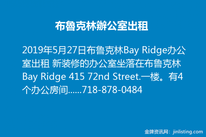 布鲁克林Bay Ridge办公室出租 新装修的办公室坐落在布鲁克林Bay Ridge 415 72nd Street.一楼。有4个办公房间,一个洗手间,一个接待室,面积1200平方英尺。可做诊所,律师所及其他办公室。有前门和侧门。月租$2600,包一个停车位。请联系:Sue: 718-878-0484