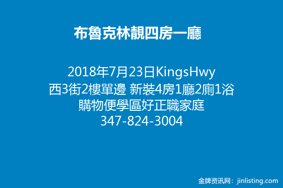 KingsHwy西3街2樓單邊新裝4房1廳2廁1浴FN車購物便學區好包水暖氣宜潔淨正職家庭譚太347-824-3004