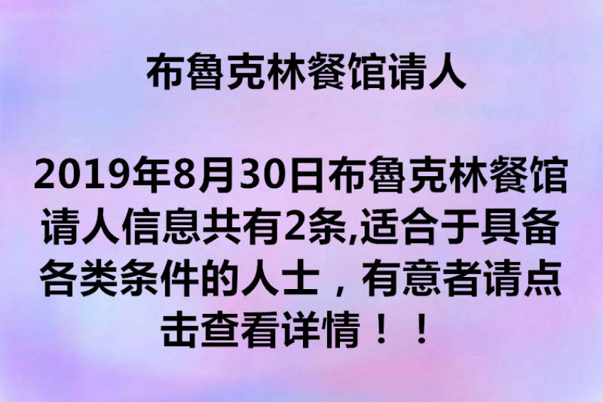 “Job Descriptions: 餐饮集团请熟手司机 需要有经验,有责任心,行车记录良好,会普通话 会英语者优先录用! 工作时间 周一至周五 8:15am-4:30pm,一周5天 需要报全税 工作地点 Brooklyn Benefits and Others: 起薪$16/小时, 60天试用期之后涨到$18/小时 升职加薪机会(取决于英语能力,职业操守,领导能力) 年终奖金 免费工作餐 How to Apply: Please CALL 917-755-8063 (Mon-Fri 9:30am-6:00pm EST) if you are interested!”