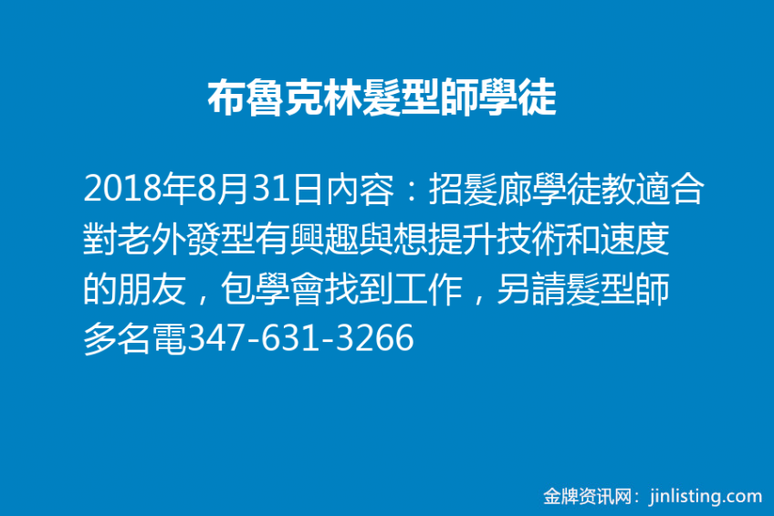 內容:招髮廊學徒教適合對老外發型有興趣與想提升技術和速度的朋友,包學會找到工作,另請髮型師多名電347-631-3266