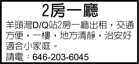 布魯克林 兩房一廳租,羊頭灣DQ站 交通方便,一樓,地方清靜,治安好,適合小家庭。請電:646-203-6045