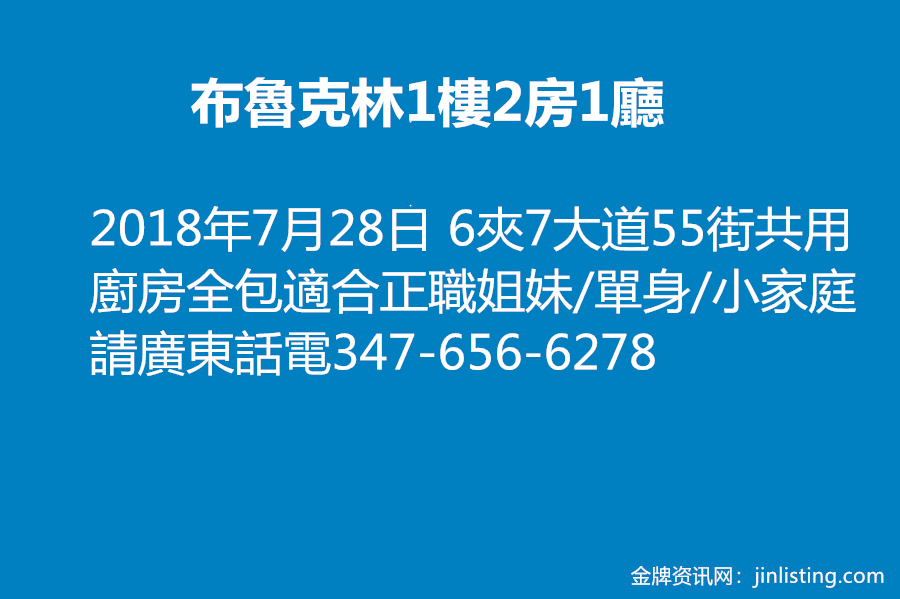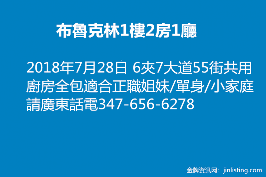 布魯克林 6夾7大道55街 1樓2房1廳 共用廚房全包適合正職姐妹/單身/小家庭請廣東話電347-656-6278或347-553-3092