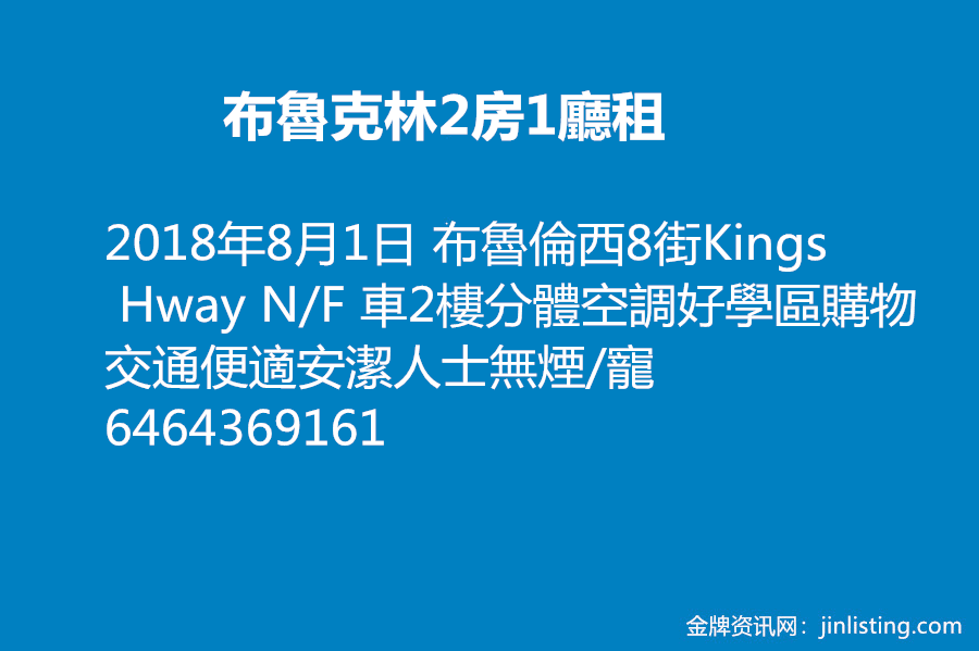 布魯倫西8街Kings Hway N/F 車2樓分體空調好學區購物交通便適安潔人士無煙/寵6464369161