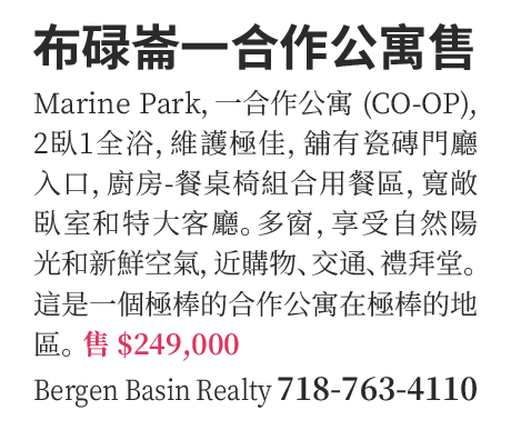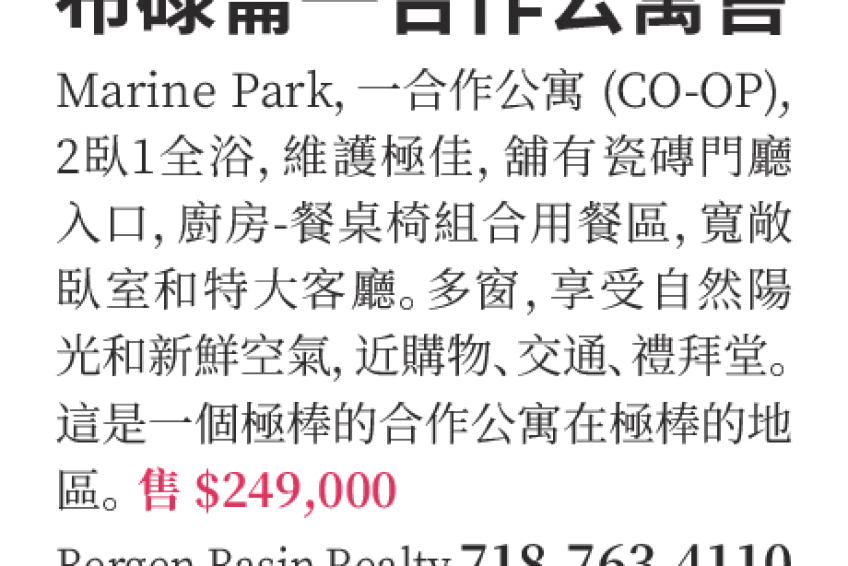 布魯崙MARINE PARK,一合作公寓(CO-OP), 2臥1全浴,維護極佳,舖有瓷磚門廳入口,廚房-餐桌椅組合用餐區,及寬敞臥室,和特大客廳。多窗,享受自然陽光和新鮮空氣,近購物、交通、禮拜堂。這是一個極棒的合作公寓在極棒的地區。 售:$249,000BERGEN BASIN REALTY 718 763 4110