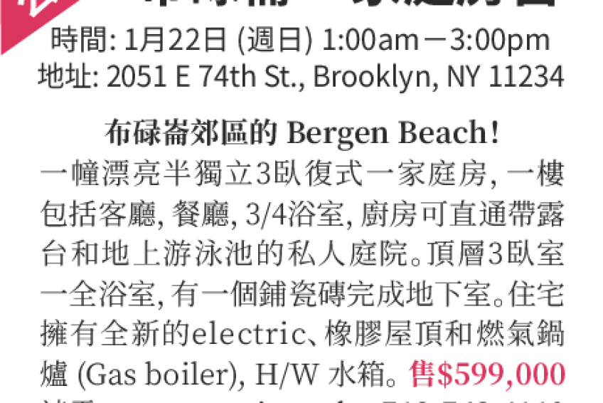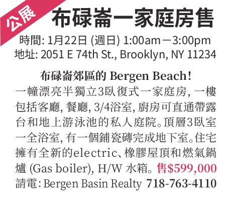 一幢漂亮,半獨立的 3臥復式一家庭房,坐落在令人向往的布魯崙BERGEN BEACH海灘。一樓包括客廳,餐廳,3/4浴室,廚房可直通帶露台和地上游泳池的私人庭院。頂層有 3 間臥室和一個全浴室,還有一個鋪瓷磚完成地下室。 住宅擁有全新的 electric,、橡膠屋頂(Rubber Roof)和燃氣鍋爐 (Gas boiler), H/W 水箱, 售$599,000