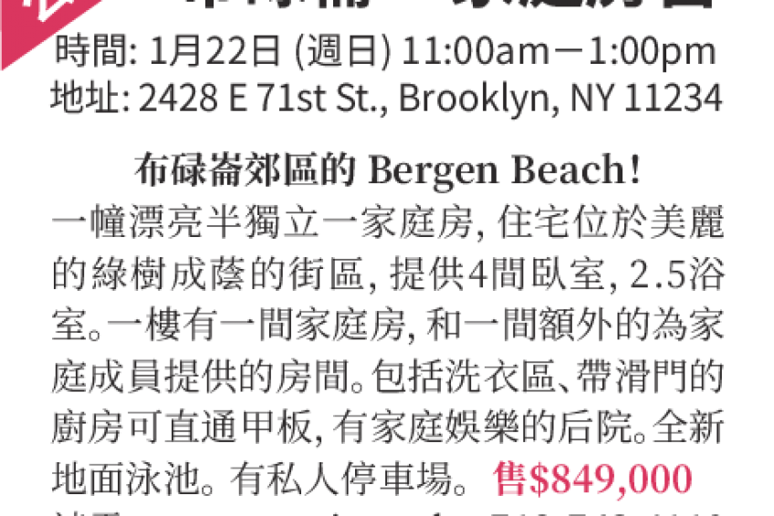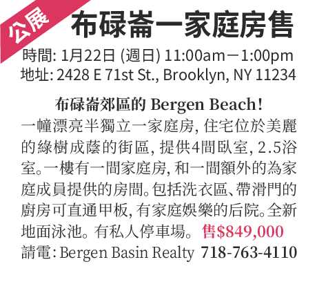 布魯崙一幢漂亮,半獨立一家庭房,坐落在被譽為“布魯克林郊區”深處的BERGEN BEACH海灘。這棟住宅位於美麗的綠樹成蔭的街區,提供 4 間臥室和2.5間浴室。 一層樓擁有一間家庭房,和一間額外的為家庭成員提供的房間。 這棟住宅還包括洗衣區、帶滑梯的廚房可直通甲板,和一帶新地面游泳池的家庭聚會的後院。 私人停車場!
