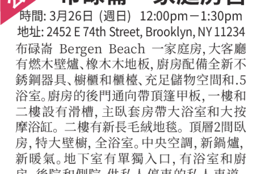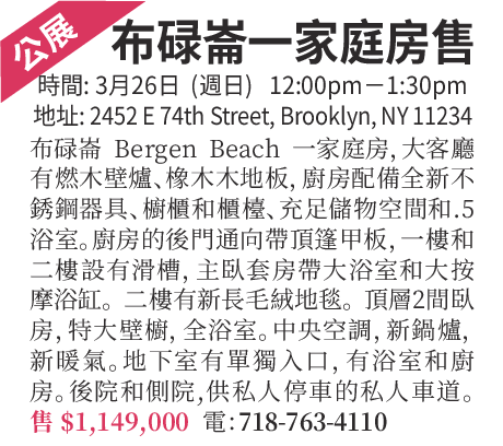 布魯崙Bergen Beach, 一家庭房,巨大正式客廳配有燃木壁爐、橡木硬鑲木地板,大凸多窗和壁爐。 廚房配備了全新,從未使用過的不銹鋼器具、白實心橡木櫥櫃和全新層壓板櫃檯、充足儲物空間和.5浴室。 廚房的後門通向巨大的帶頂篷的甲板,供家庭娛樂。 一樓和二樓設有滑槽,可將您的衣物存放在地下室洗衣機旁。 主臥套房帶大浴室和可供2人以上使用的大按摩浴缸。 二樓有新長毛絨地毯。 頂層有2間額外臥房,特大壁櫥,另一間全浴室。中央空調,新鍋爐,新暖氣。 地下室有單獨入口,帶有一個全浴室(目前是半浴室)和廚房。後院和側院空間為園藝和遊樂所使用,供私人停車的私人車道。售$1,149,000,