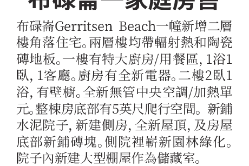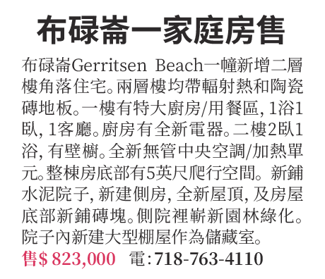 布魯崙Gerritsen Beach海灘,一幢新增二層樓角落住宅。這幢全翻新的智能房,兩層樓均帶輻射熱和陶瓷磚地板。 一樓設有一特大廚房/用餐區,1浴1臥(牆壁被拆掉以打開廚房區域),洗衣房內有鍋爐,1間帶大教堂天花板客廳。 廚房有全新電器(爐子不包括在售價內)。 二樓2臥和1間帶蒸汽淋浴浴室。 主臥房有2壁櫥,其中一壁櫥是步入式壁櫥。 第二間臥室有2壁櫥。 新安裝全新無管中央空調/加熱單元。整棟房子底部有5英尺爬行空間。 新鋪水泥院子,新建側房,全新屋頂,及房屋底部新鋪磚塊。側院裡嶄新園林綠化。 新弓型窗安裝在房子的前端。院子內新建大型棚屋作為儲藏室。 如需要,房子可在一樓增加第三間臥室。 售$ 823,000