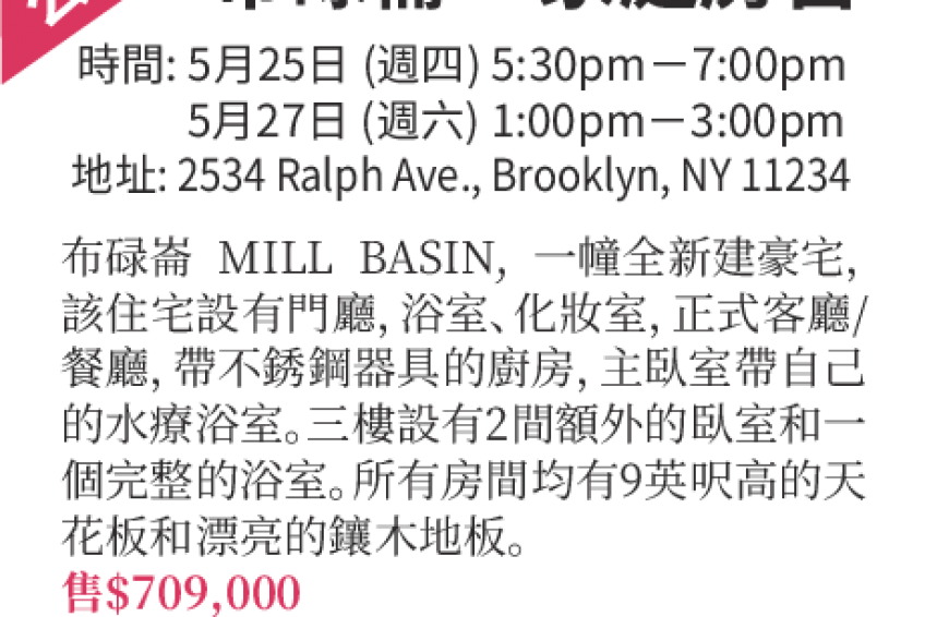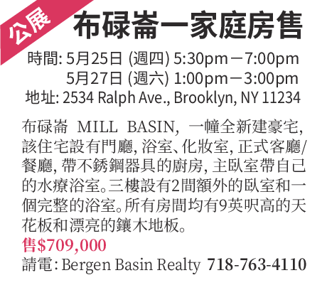 布魯崙Mill Basin,一幢漂亮的,半相聯的3臥室複式公寓,每層樓都有一個浴室,位置優,近餐廳、購物,和交通。這幢可愛的住宅擁有高天花板,硬木地板,中央空調,寬敞的完成地下室,及宅后停車場。極佳的購買機會,提供私人參觀,售$709,000,