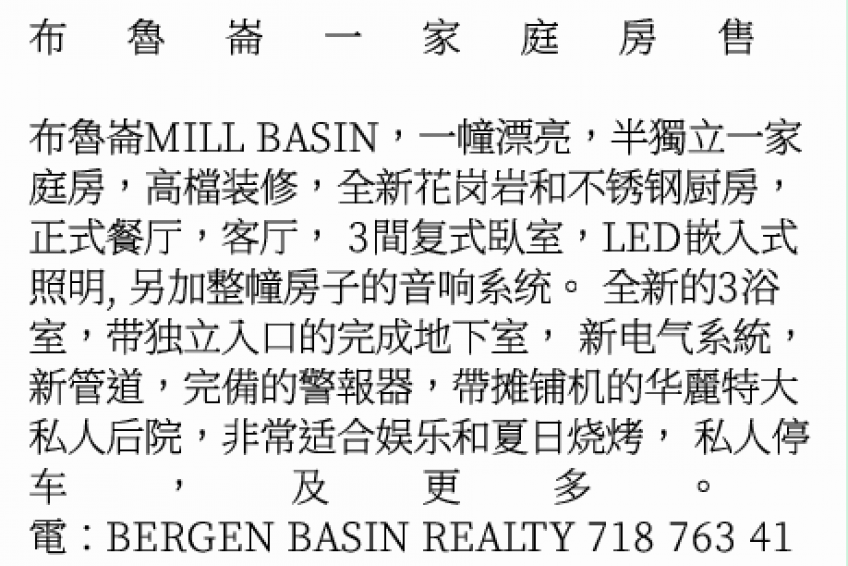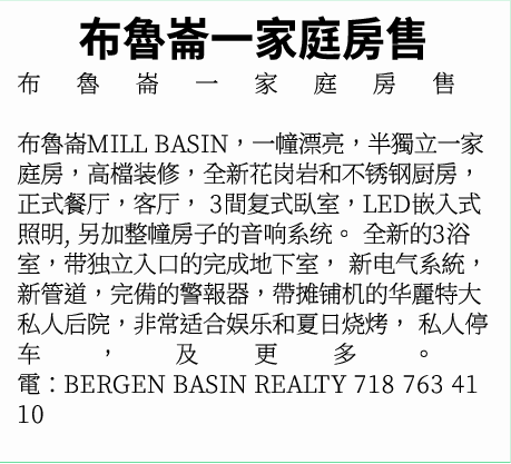 布魯崙MILL BASIN,一幢漂亮,半獨立一家庭房,高檔装修,全新花岗岩和不锈钢厨房,正式餐厅,客厅, 3間复式臥室,LED嵌入式照明, 另加整幢房子的音响系统。 全新的3浴室,带独立入口的完成地下室, 新电气系統,新管道,完備的警報器,帶摊铺机的华麗特大私人后院,非常适合娱乐和夏日烧烤, 私人停车,及更多。電:BERGEN BASIN REALTY 718 763 4110