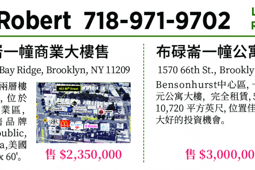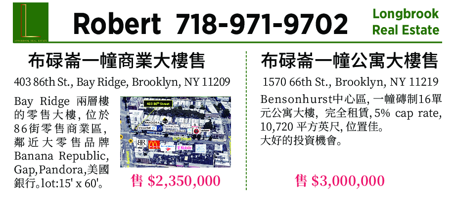 布魯崙Bay Ridge一棟兩層樓的零售大樓,位於著名86 街零售商業區(在第 4 大道和第5 大道間),大零售品牌有 Banana Republic, Gap,Pandora,麥當勞, Foot Locker, 美國銀行,T-Mobile , Spectrum 等, lot: 15′ x 60′, 售 $2,350,000, 電:718-971-9702