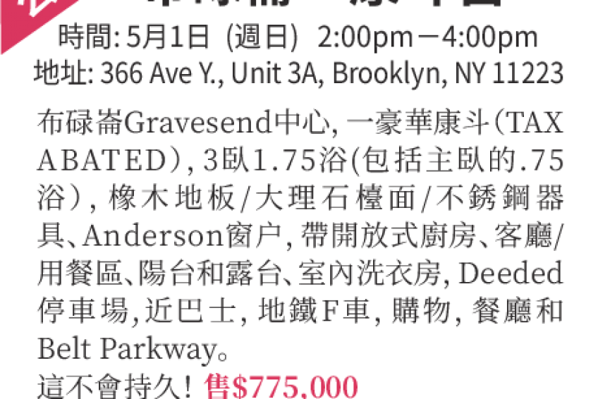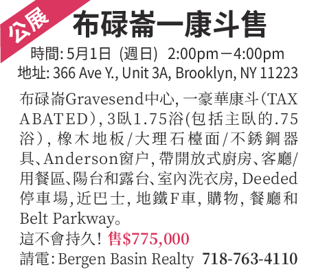 布魯崙Gravesend中心,一 豪華康斗(TAX ABATED),3臥1.75浴(包括主臥的.75 浴),橡木地板/大理石檯面/不銹鋼器具、Anderson窗戶,帶開放式廚房、客廳/用餐區、陽台和露台 室內洗衣房,Deeded停車場, 近巴士,地鐵F車,購物,餐廳和 Belt Parkway。 這不會持久! 售$775,000