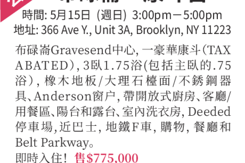 布魯崙Gravesend中心,一 豪華康斗(TAX ABATED),3臥1.75浴(包括主臥的.75 浴),橡木地板/大理石檯面/不銹鋼器具、Anderson窗戶,帶開放式廚房、客廳/用餐區、陽台和露台 室內洗衣房,Deeded停車場, 近巴士,地鐵F車,購物,餐廳和 Belt Parkway。即時入住! 售$775,000