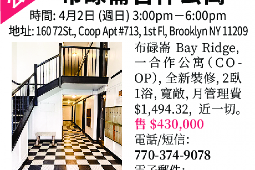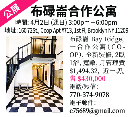 公展時間:4月2日 下午 3 點 至 下午 6 點地址:160 72nd Street Coop Apt # 713, 1st Floor Brooklyn NY 11209布魯崙Bay Ridge, 一合作公寓(CO-OP),全新裝修,2臥1浴,寬敞,月管理費$1,494.32, 近一切, 售$440,000,電話/短信 770-374-9078,電子郵件: c75689@gmail.com