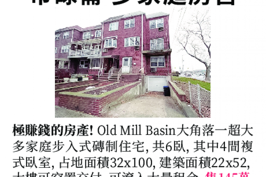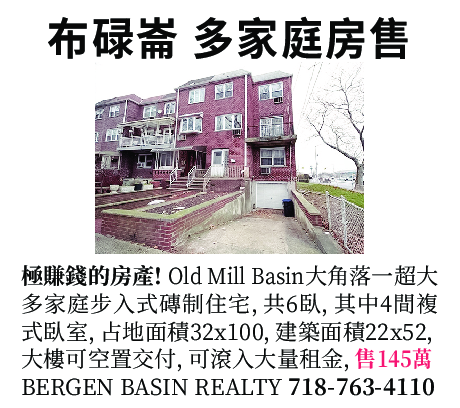 布魯崙OLD MILL BASIN, 一幢超大多家庭磚制住宅,共6間臥室,其中4間複式臥室,步入式住宅,大角落地段,占地面積32 x 100,建築尺寸22 x 52,大樓可空置交付,可滾入大量租金, 專業人士最理想的角落房產,售$1,450,000, 電:BERGEN BASIN REALTY  (718) 763 4110