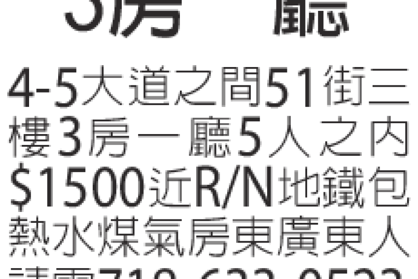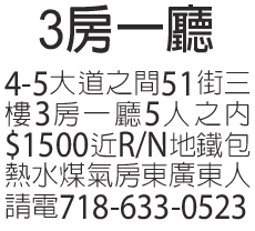 布魯崙4-5大道之間51街三樓3房1廳5人之內$1500近RN地鐵包熱水煤氣房廣東人718-633-0523/516-835-1398