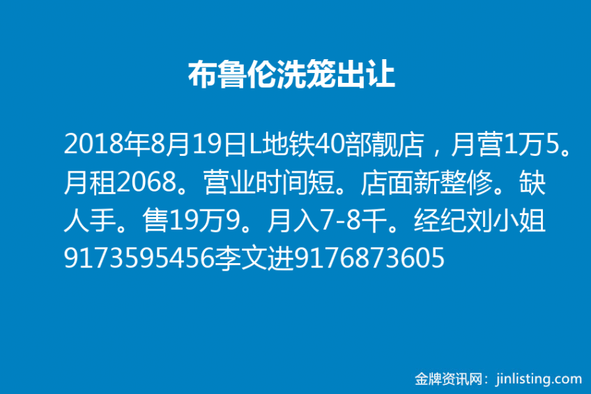布鲁伦洗笼出让 L地铁40部靓店,月营1万5。月租2068。营业时间短。店面新整修。缺人手。售19万9。月入7-8千。经纪刘小姐9173595456李文进9176873605 **港榕地产—–华人唯一一家专业买卖洗衣店的地产公司 微信号:karenliu1688