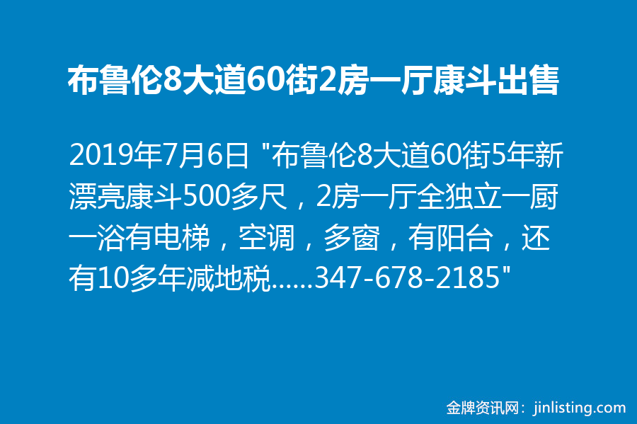 布鲁伦8大道60街2房一厅康斗出售 “布鲁伦8大道60街5年新漂亮康斗500多尺,2房一厅全独立一厨一浴有电梯,空调,多窗,有阳台,还有10多年减地税。 近N车及巴士,购物餐馆十分方便。售$49.9万 。 有兴趣请call潘太: 347-678-2185”