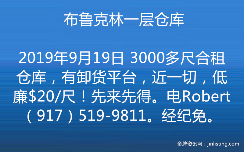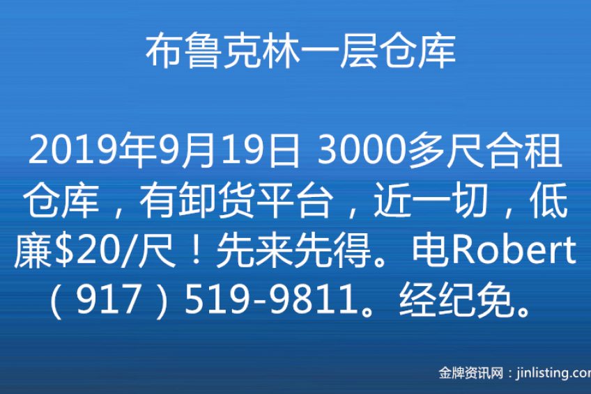 布鲁克林一层仓库,3000多尺合租仓库,有卸货平台,近一切,低廉$20/尺!先来先得。电Robert(917)519-9811。经纪免。