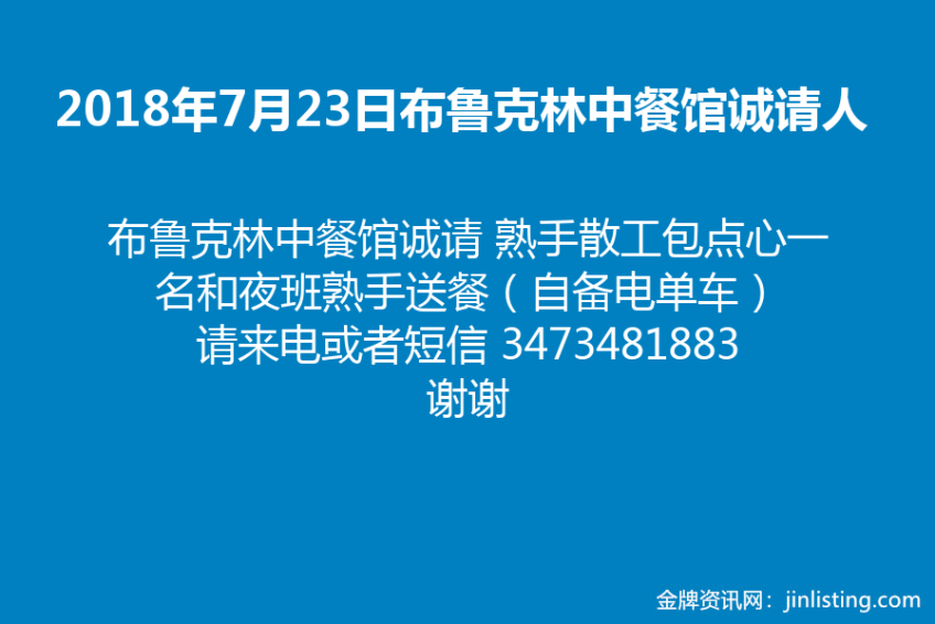 布鲁克林中餐馆诚请 熟手散工包点心一名和夜班熟手送餐(自备电单车) 请来电或者短信 3473481883 谢谢