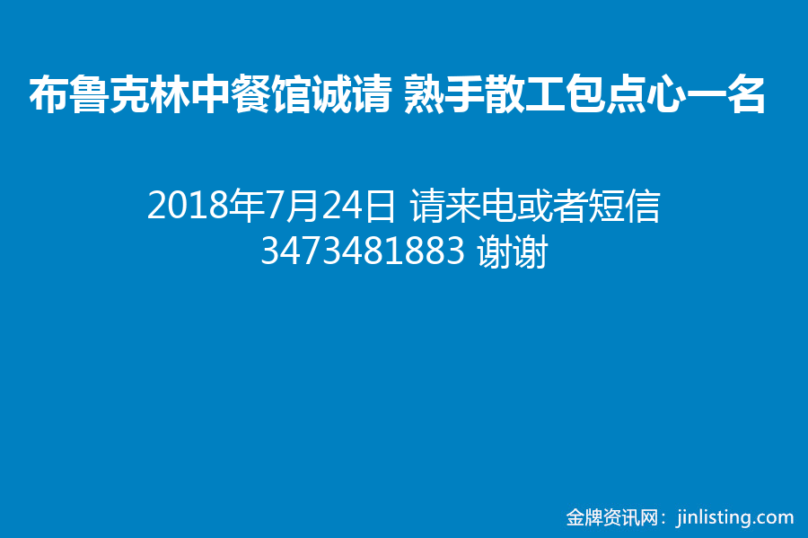 布鲁克林中餐馆诚请 熟手散工包点心一名3473481883