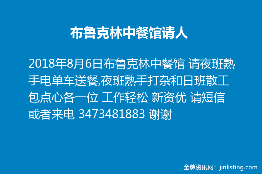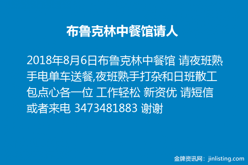 布鲁克林中餐馆 请夜班熟手电单车送餐,夜班熟手打杂和日班散工包点心各一位 工作轻松 新资优 请短信或者来电 3473481883 谢谢