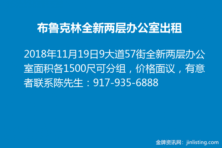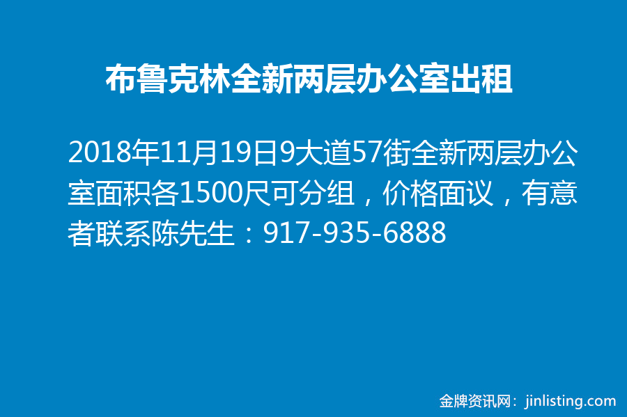 布鲁克林全新两层办公室出租 9大道57街全新两层办公室面积各1500尺可分组,价格面议,有意者联系陈先生:917-935-6888