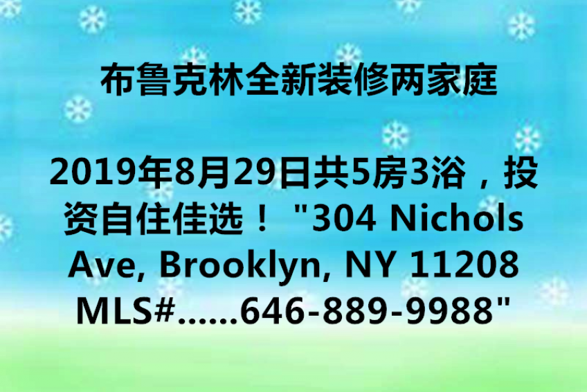 布鲁克林全新装修两家庭,共5房3浴,投资自住佳选! “304 Nichols Ave, Brooklyn, NY 11208 MLS#3105422 全新装修两家庭,每层800余尺,共5房3浴+完成地下室!临近多个公园,地理位置极佳,交通便捷, 旁边就是Atlantic Ave,三分钟上State Rd,步行五分钟可到J和Z线。周围有超多10分高中!自住投资佳选! 售价: $768,000 欢迎合作!646-889-9988”