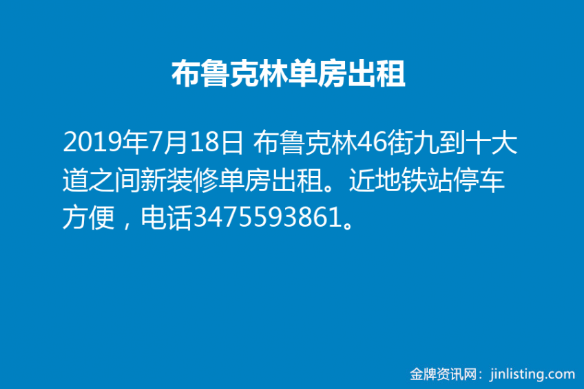 布鲁克林46街九到十大道之间新装修单房出租。近地铁站停车方便,电话3475593861。