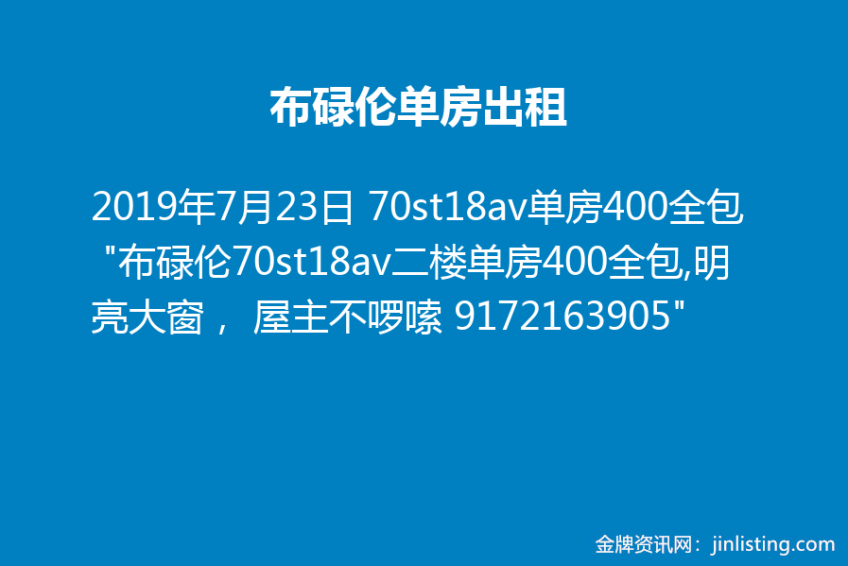 70st18av单房400全包 “布碌伦70st18av二楼单房400全包,明亮大窗, 屋主不啰嗦 9172163905”