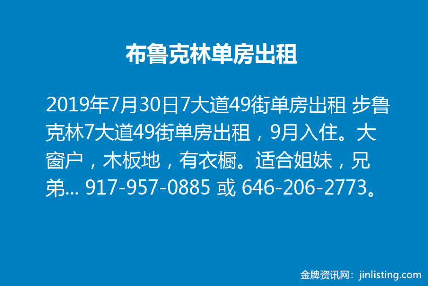 7大道49街单房出租 步鲁克林7大道49街单房出租,9月入住。大窗户,木板地,有衣橱。适合姐妹,兄弟,夫妻,学生等。拎包入住。有意者请电 917-957-0885 或 646-206-2773。