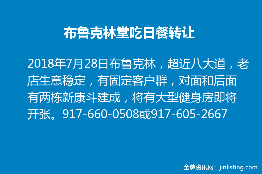 布鲁克林,超近八大道,老店生意稳定,有固定客户群,对面和后面有两栋新康斗建成,将近100户,将有大型健身房即将开张,极有增长潜力,因有其他业务,无法兼顾餐馆,所以转让。有意请联系 Jimmy 917-660-0508或 Tommy 917-605-2667, 价格面议。 非诚勿扰谢谢。