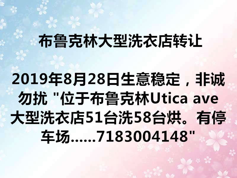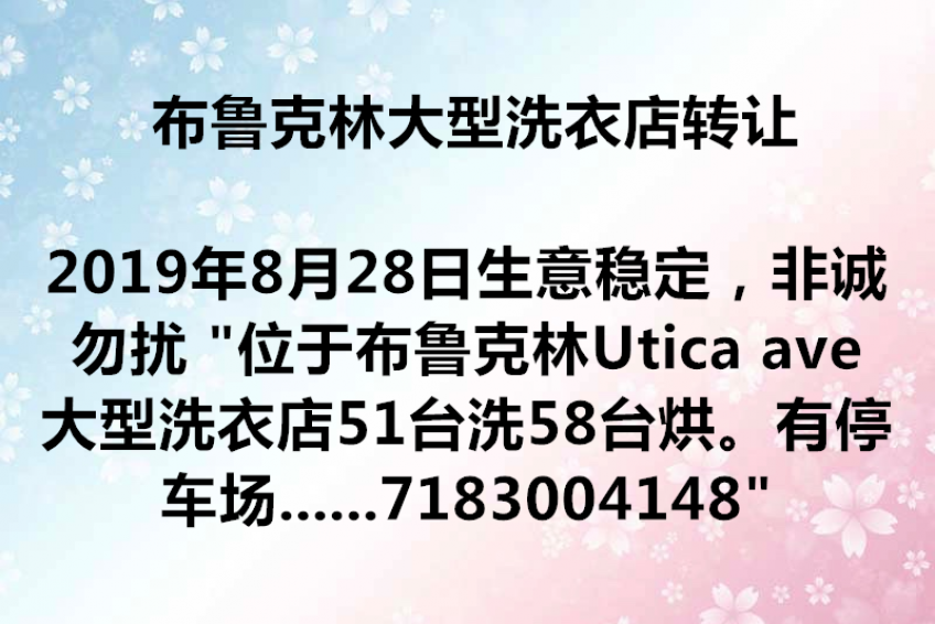 布鲁克林大型洗衣店转让,生意稳定,非诚勿扰 “位于布鲁克林Utica ave大型洗衣店51台洗58台烘。有停车场。生意稳定,13年租约 生意5.6万/月,全部请人,升值空间大 店内消费全部使用洗衣卡,没有现金,不用担心安全问题,在繁忙街道上, 靠近学校,超市。 适合投资或者家庭生意 价格面议,有意者请致电 黄先生7183004148”