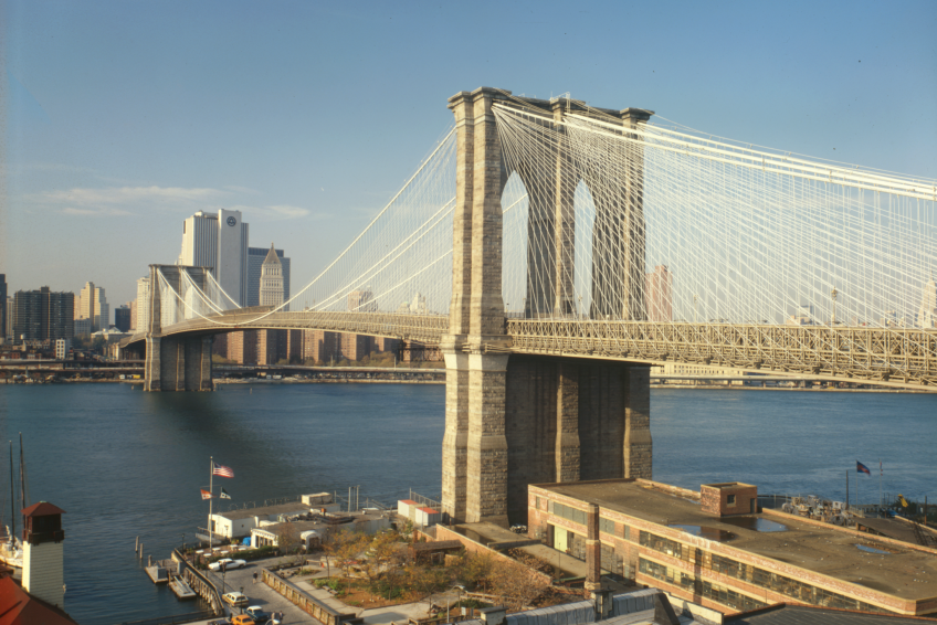 連接曼哈頓與布魯克林,美國最老的懸索橋之一,建於1883年。市象徵性景點之一。大橋全長1834米,橋身由上萬根鋼索吊離水面41米,是當年世界上最長的懸索橋,也是世界上首次以鋼材建造的大橋,落成時被認為是繼世界古代七大奇蹟之後的第八大奇蹟,被譽為工業革命時代全世界7個劃時代的建築工程奇蹟之一。