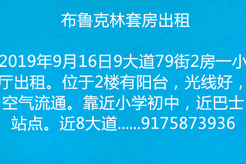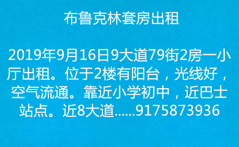 9大道79街2房一小厅出租。 位于2楼有阳台,光线好,空气流通。靠近小学初中,近巴士站点。近8大道一切很方便。学区好,地区治安好。月底可入住。有意者请电:6464003312。或者9175873936。非诚勿扰谢谢!