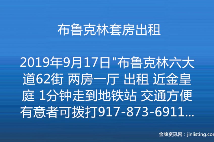 “布鲁克林六大道62街 两房一厅 出租 近金皇庭 1分钟走到地铁站 交通方便 有意者可拨打917-873-6911 中午3点后可打电话咨询 或➕微信taichitea”