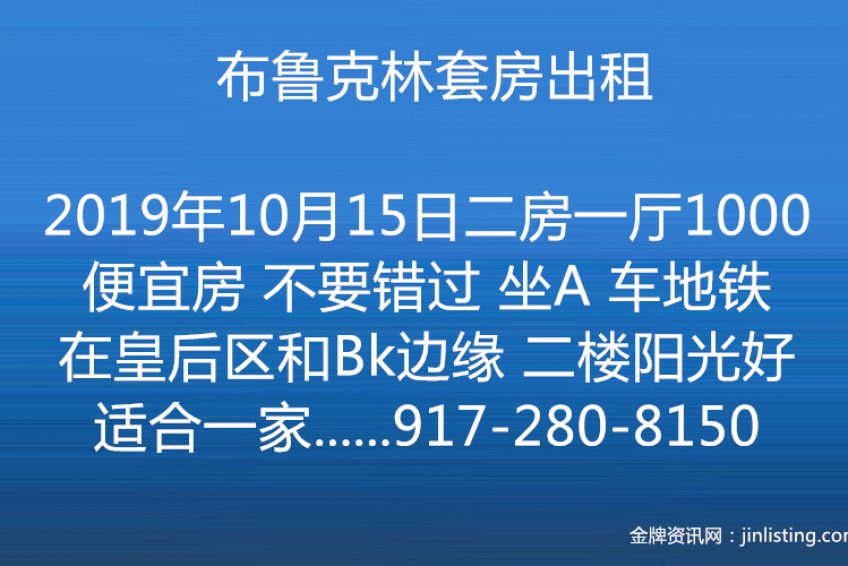 二房一厅1000 便宜房 不要错过 坐A 车地铁在皇后区和Bk边缘 二楼阳光好 适合一家三口住 水电煤全包 有意发信息917-280-8150
