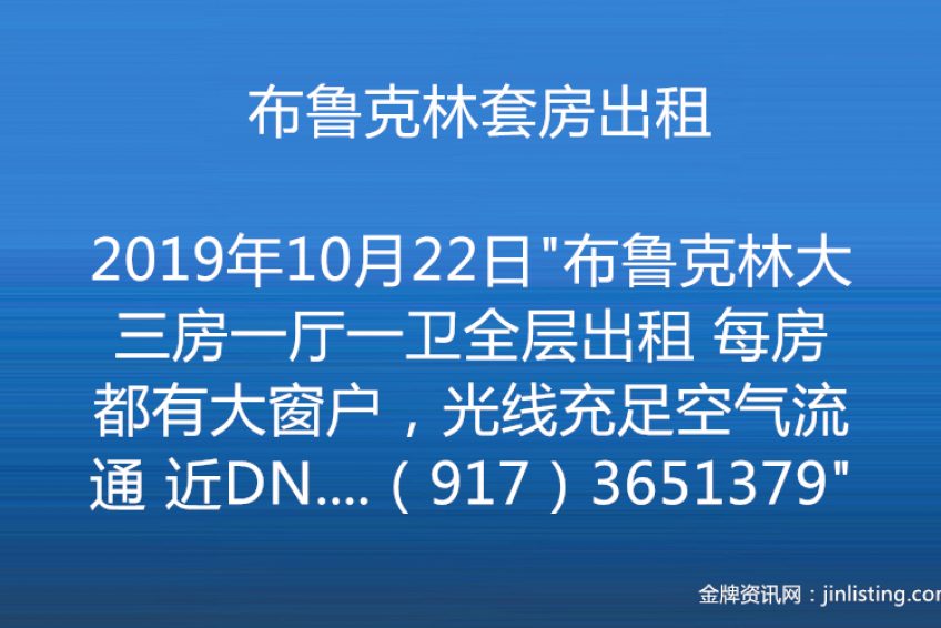 “布鲁克林大三房一厅一卫全层出租 每房都有大窗户,光线充足空气流通 近DN车,近超市,近学校,一流学区 12大道65街 有意请致电:(917)3651379”