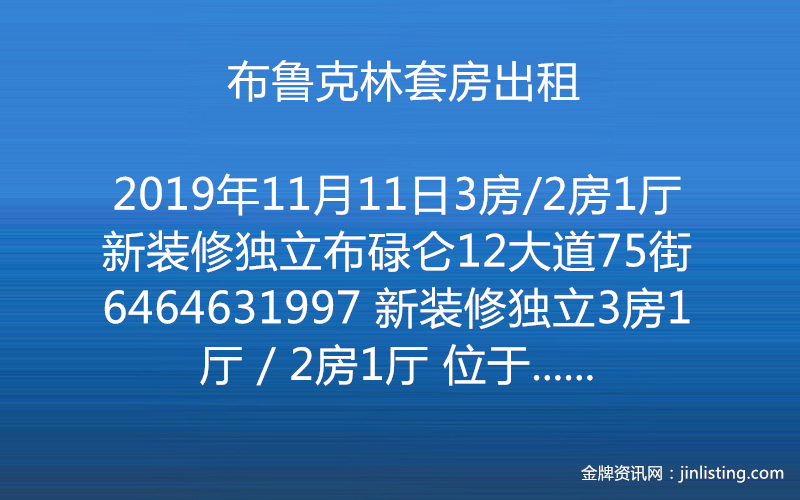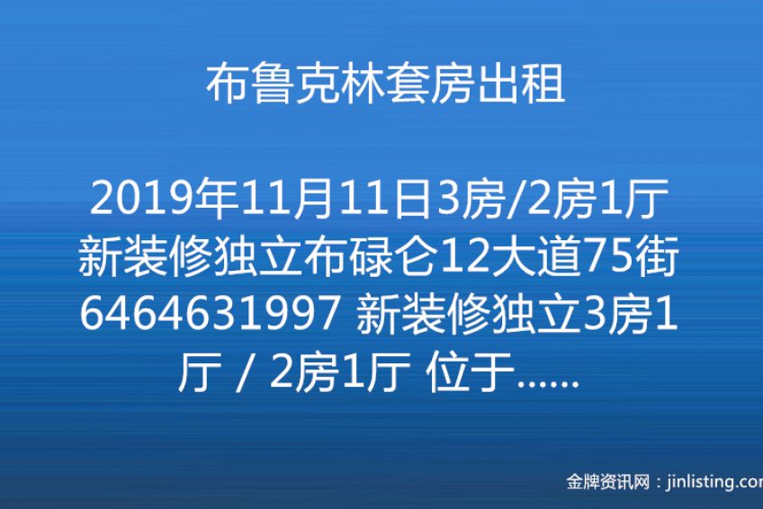 3房/2房1厅新装修独立布碌仑12大道75街6464631997 新装修独立3房1厅 / 2房1厅 位于布碌仑12大道之间75街 有大阳台,每房都有窗,近华人超市,近地铁车,近中下学校,交通方便,近公园,近图书馆, 有意请电 6464631997