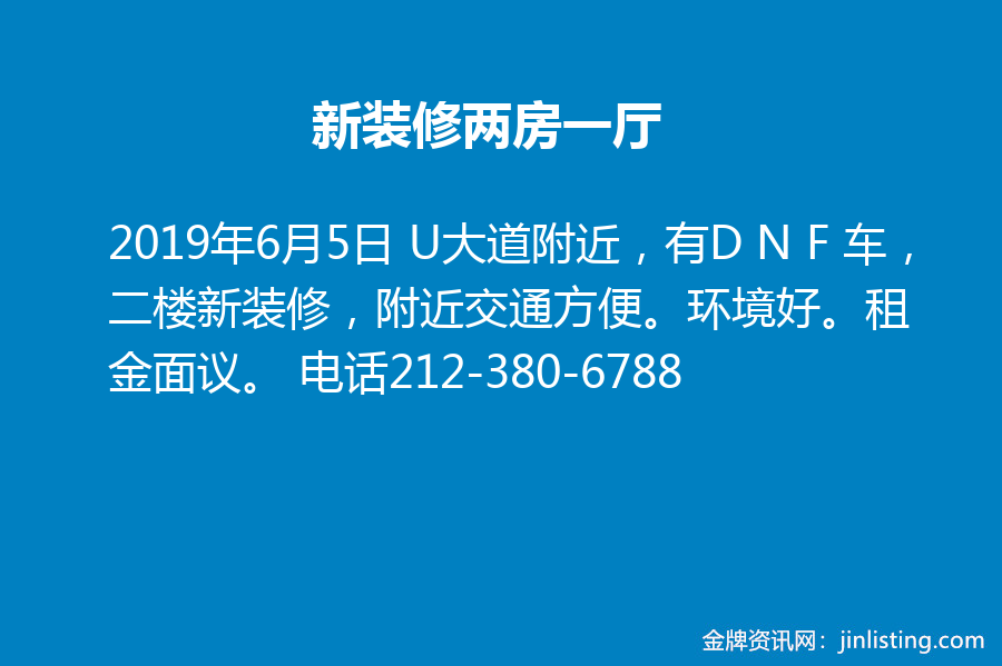 新装修两房一厅 U大道附近,有D N F 车,二楼新装修,附近交通方便。环境好。租金面议。 电话212-380-6788