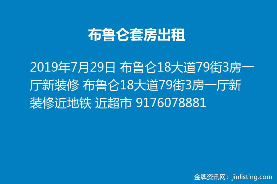 布鲁仑18大道79街3房一厅新装修 布鲁仑18大道79街3房一厅新装修近地铁 近超市 9176078881