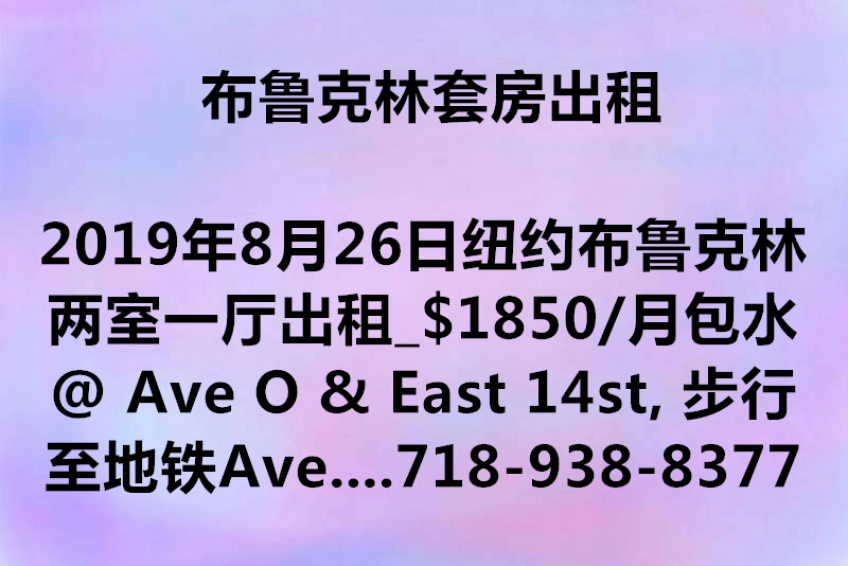 “纽约布鲁克林两室一厅出租_$1850/月包水 @ Ave O & East 14st, 步行至地铁Ave M车站(B,Q)8分钟。 安静祥和社区,小型公寓楼2楼。 全新装修两个卧室,一个大客厅,一个洗手间。 室内洗衣机,带阳台,两室一厅$1850/月。 一年签约,国际学生入住手续简单。 同楼另一套5楼不带室内洗衣机两室一厅$1750/月。 咨询看房Wendy 电话:718-938-8377 微信:Q612597 邮件:wendy@taichirealty.com 公司网址:http://www.taichirealty.com”