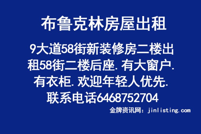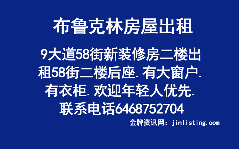 9大道58街新装修房二楼出租. 58街二楼后座.有大窗户.有衣柜.欢迎年轻人优先.联系电话6468752704