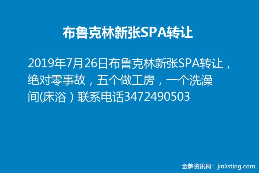 布鲁克林新张SPA转让,绝对零事故,五个做工房,一个洗澡间(床浴)联系电话3472490503