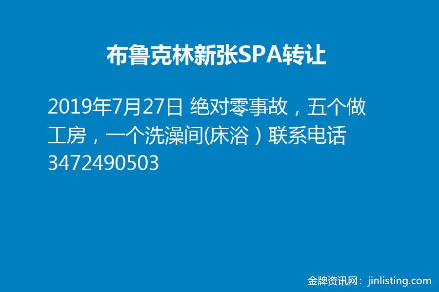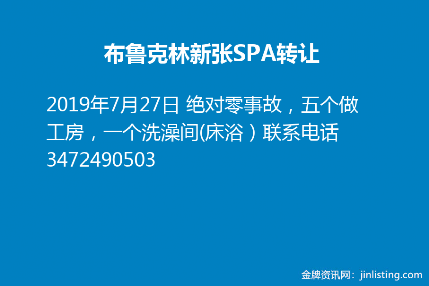 布鲁克林新张SPA转让,绝对零事故,五个做工房,一个洗澡间(床浴)联系电话3472490503